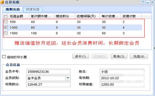会员营销系统提供了功能强大的会员储值卡功能,不仅能实现简单的充送规格,还能实现赠送部分按月返还的形式(如中国移动的赠送话费按月返还功能),这样既能让利于会员,又能锁定顾客回头消费,一举两得。