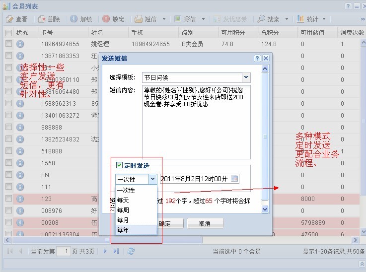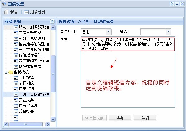 内置正规的短信平台。短信的运用,配合详细的会员信息和消费记录使各种先进的营销手段的运用成为可能。灵活应用短信平台还可以实现精确营销,短信且支持回复,会员可通过短信回复,把意见和建议反馈至商家,加强感情营销,增加会员满意度;