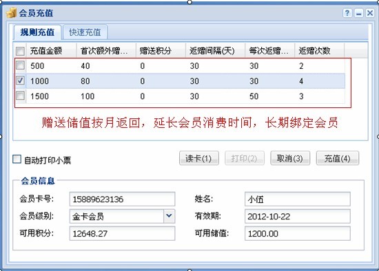 会员营销系统提供了功能强大的会员储值卡功能,不仅能实现简单的充送规格,还能实现赠送部分按月返还的形式(如中国移动的赠送话费按月返还功能),这样既能让利于会员,又能锁定顾客回头消费,一举两得。