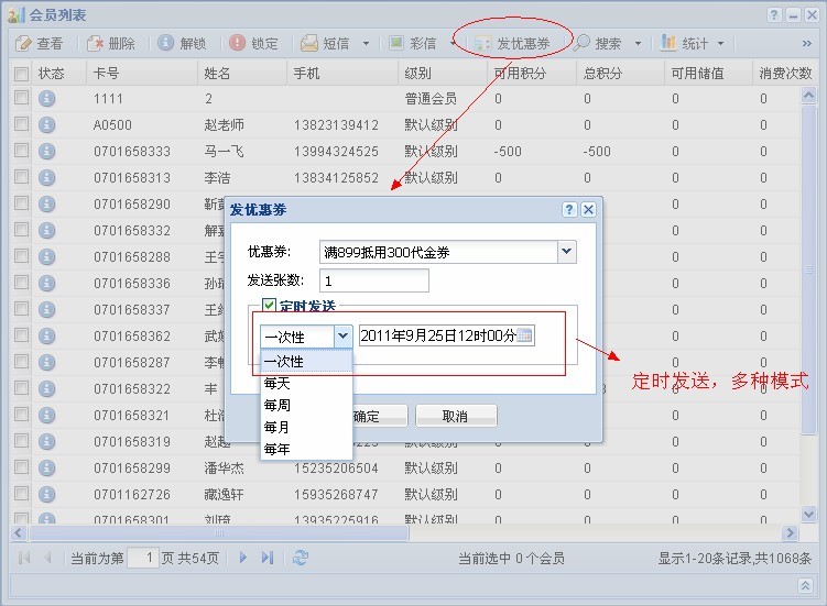 既可向系统内的会员群发优惠券,也可以给散客手机号下发优惠券,可通过短信(SMS)、彩信(MMS)等形式下发。