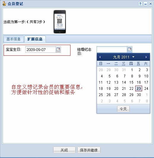 会员登记,可根据您的实际需求, 免费增加新的记录字段,如结婚纪念日,宝宝生日等。为会员提高更优质体贴的服务。