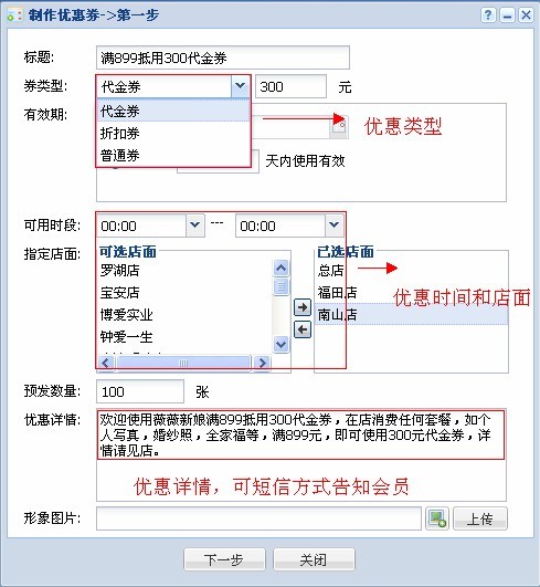 普通券:不同于上面两种,还根据顾客需求,额外开发了普通券。可实现比如商家店里某一种产品过剩,或者拿出某一种产品来做促销,就把对应的产品做成优惠券,购买时只抵对应产品 的价格(或直接换取)。